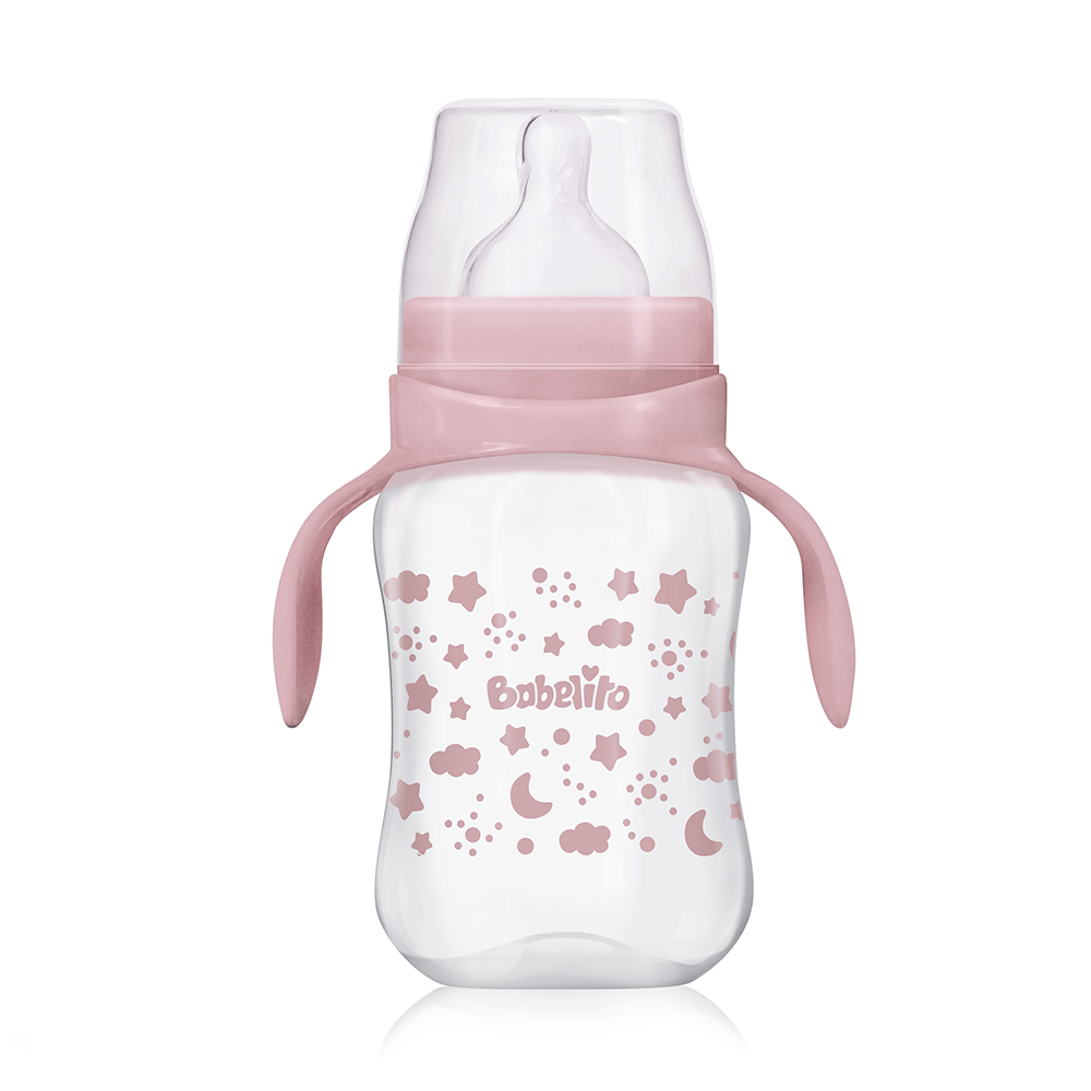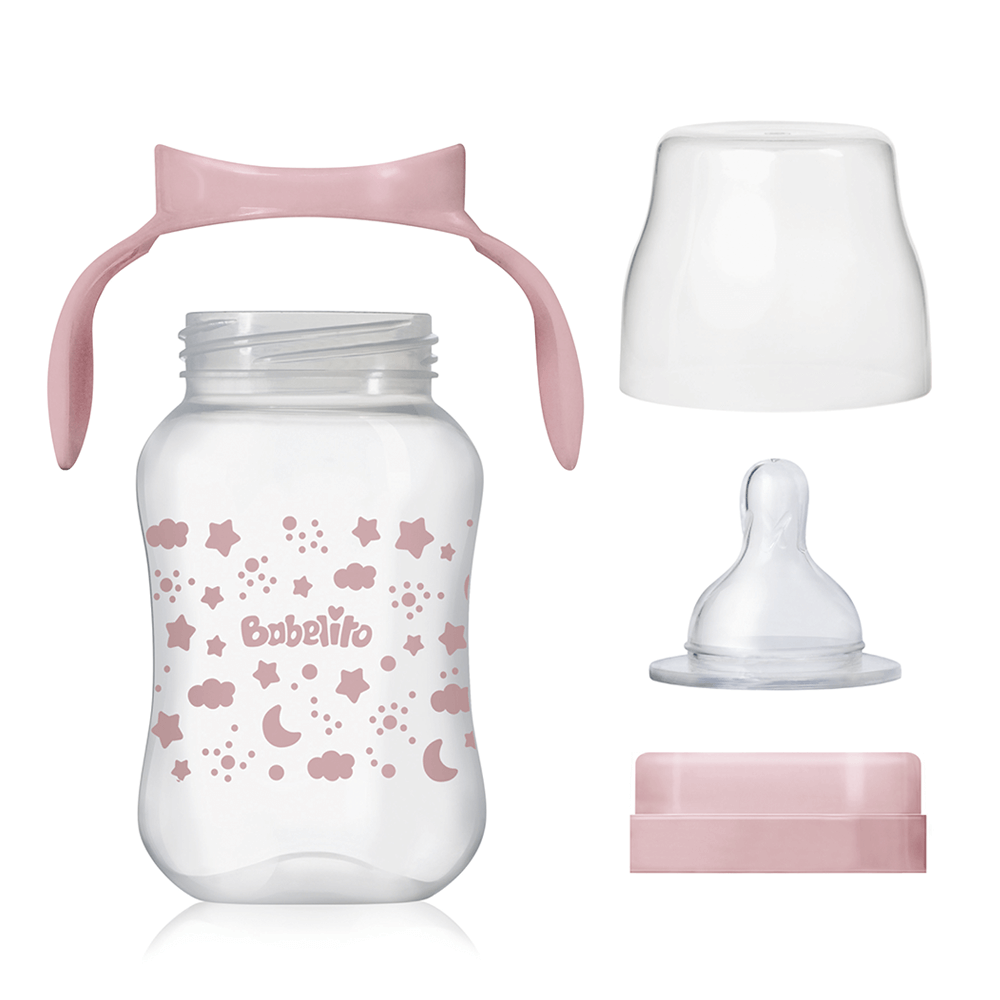 Nuevo biberón boca ancha con asas y tetina de silicona: posee válvula de aire en la base, el aire se direcciona hacia la válvula de ventilación e ingresa al biberón, provocando una salida constante de alimento, minimizando la ingesta de aire y reduciendo así, el riesgo de cólicos e hipo para tu bebé. La amplitud de la boca de la botella facilita su limpieza. Además, el capuchón del biberón actúa como un tope para la tetina, y previene el derrame de líquido. Sus asas son desmontables facilitan la autonomía de tu bebé.