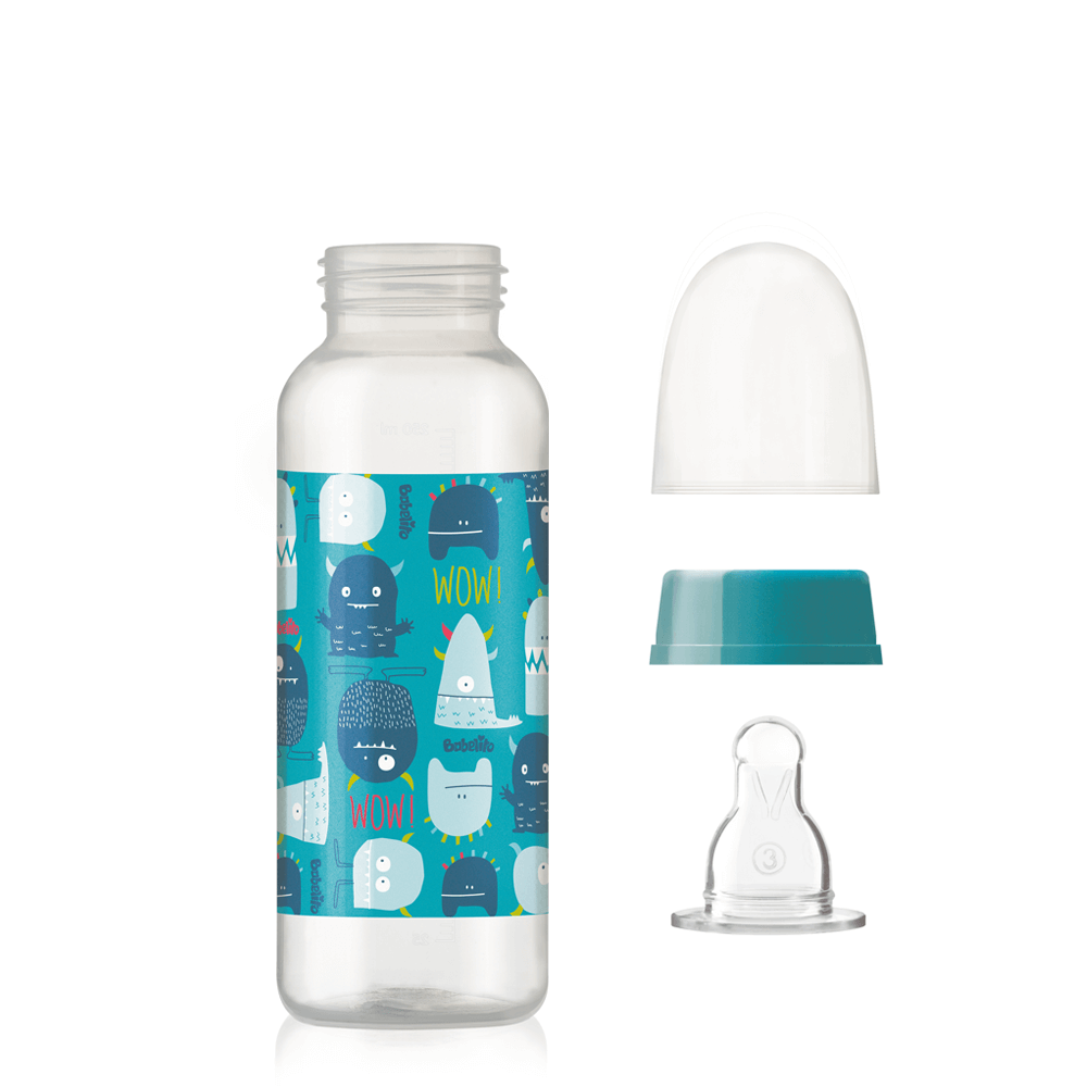 Materiales: Botella, rosca y capuchón: PP / Tetina: Silicona.