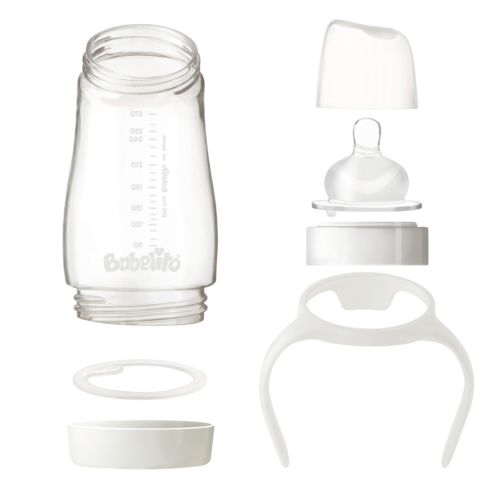 La botella está fabricada en Tritan, un material súper transparente, más seguro e higiénico gracias a su baja porosidad. El biberón viene con tetina de silicona boca ancha tamaño 1. La tetina posee válvula de aire en su base: el aire se direcciona hacia la válvula de ventilación e ingresa al biberón, provocando una salida constante de alimento, minimizando la ingesta de aire y reduciendo así, el riesgo de cólicos e hipo para tu bebé.