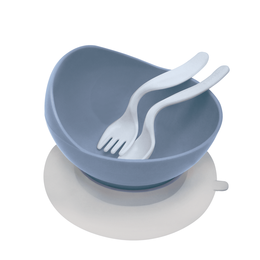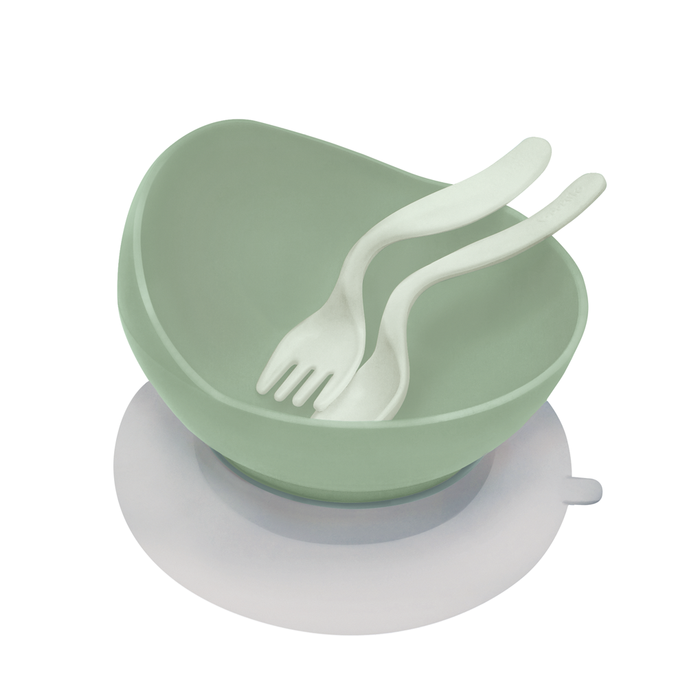 Nuestro nuevo tazón con cubiertos es ideal para ayudar al bebé en el aprendizaje a llevarse sus primeros alimentos a la boca por sí solo de manera simple y segura, colaborando en su crecimiento y autonomía. El tazón tiene una sopapa antideslizante en la base que lo adhiere a la mesa o superficie, evitando que el bebé lo vuelque con sus movimientos. Tiene una pared más alta y curva para facilitar la recolección de la comida con los cubiertos. Los cubiertos no tienen bordes salientes ni puntas peligrosas que puedan lastimar sus labios y encías. Su diseño en ángulo te permite alimentar cómodamente a tu bebé en forma lateral, y además, le ayuda a tu bebé a llevarse sus primeros alimentos a la boca solito.