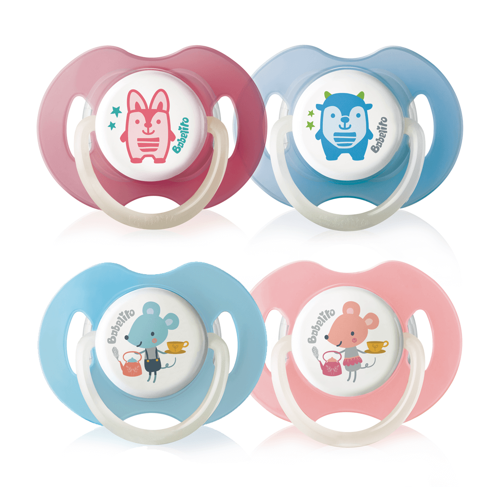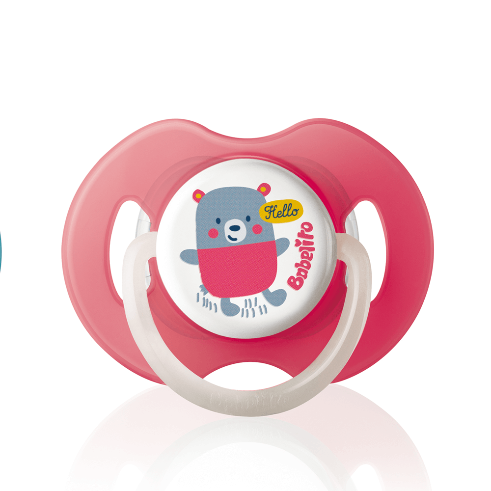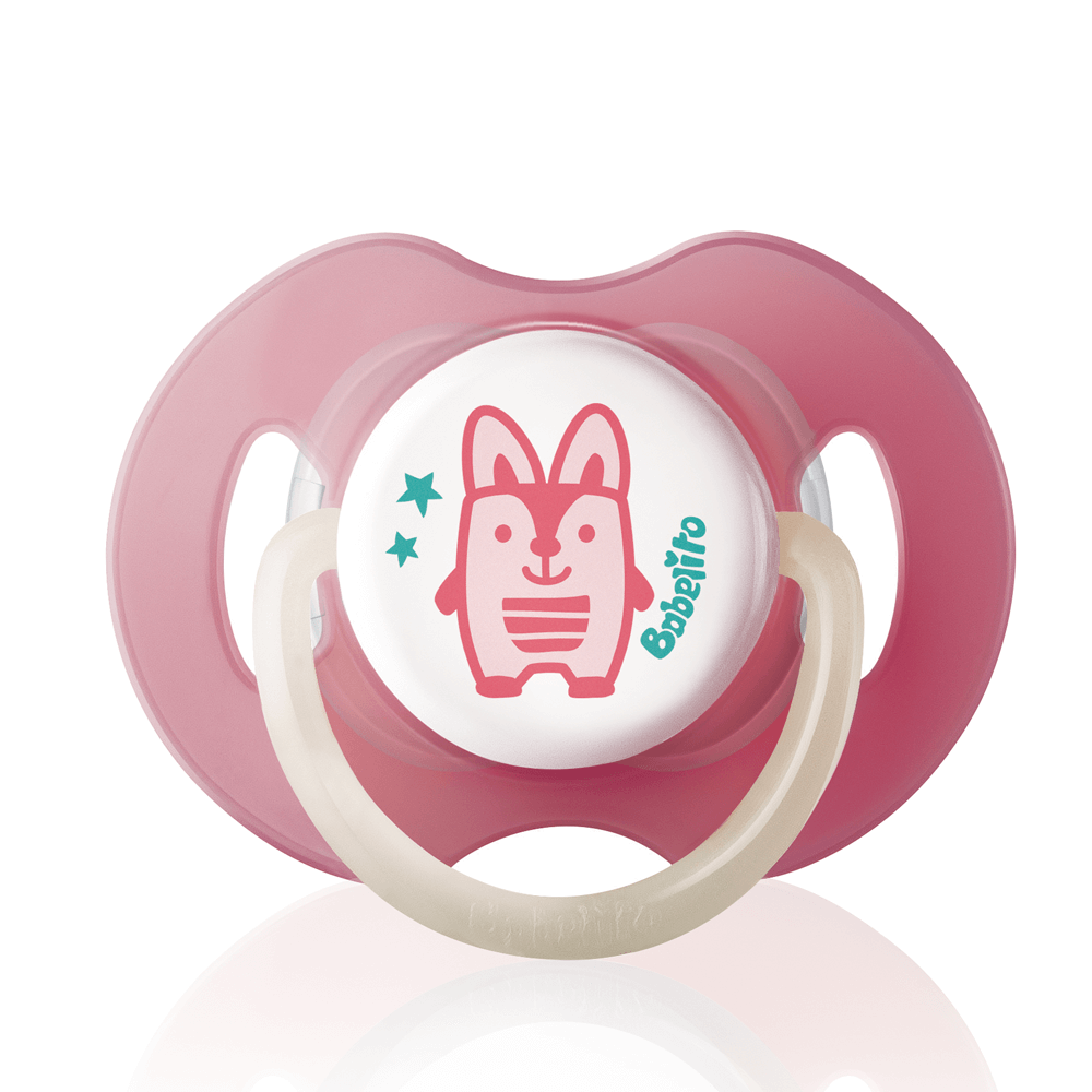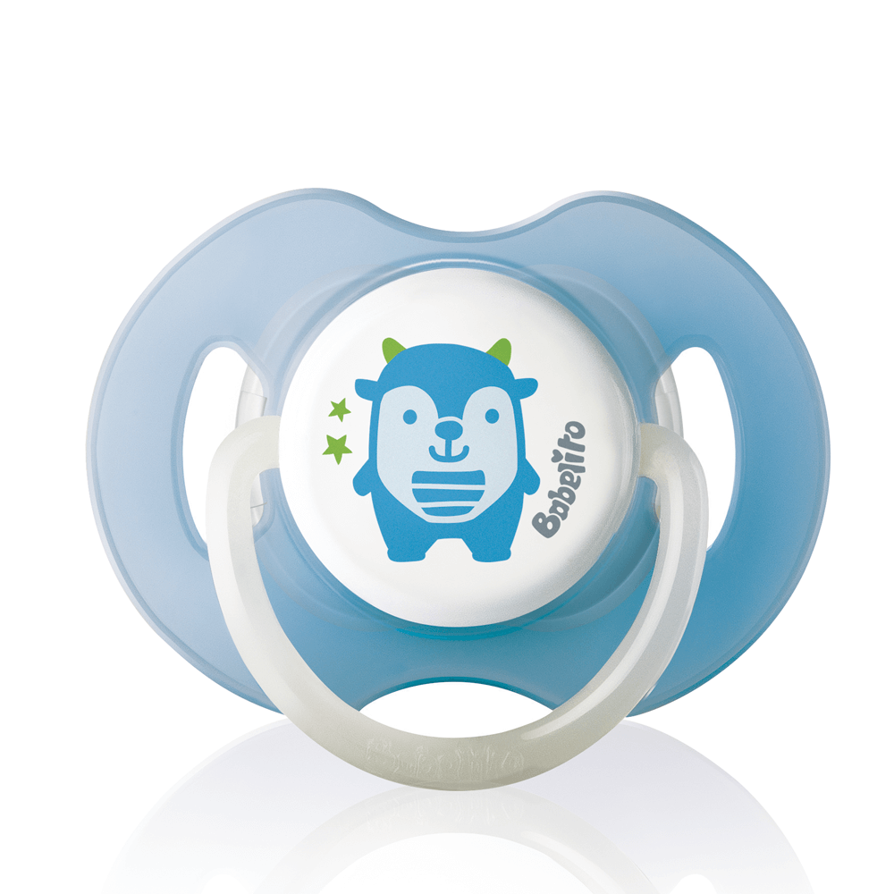 Chupete luminoso Babelito con aro que brilla en la oscuridad. Tetina redonda de silicona suave y flexible. Con capuchón higiénico y escudo ventilado. Libre de EA, BPA y BPS.