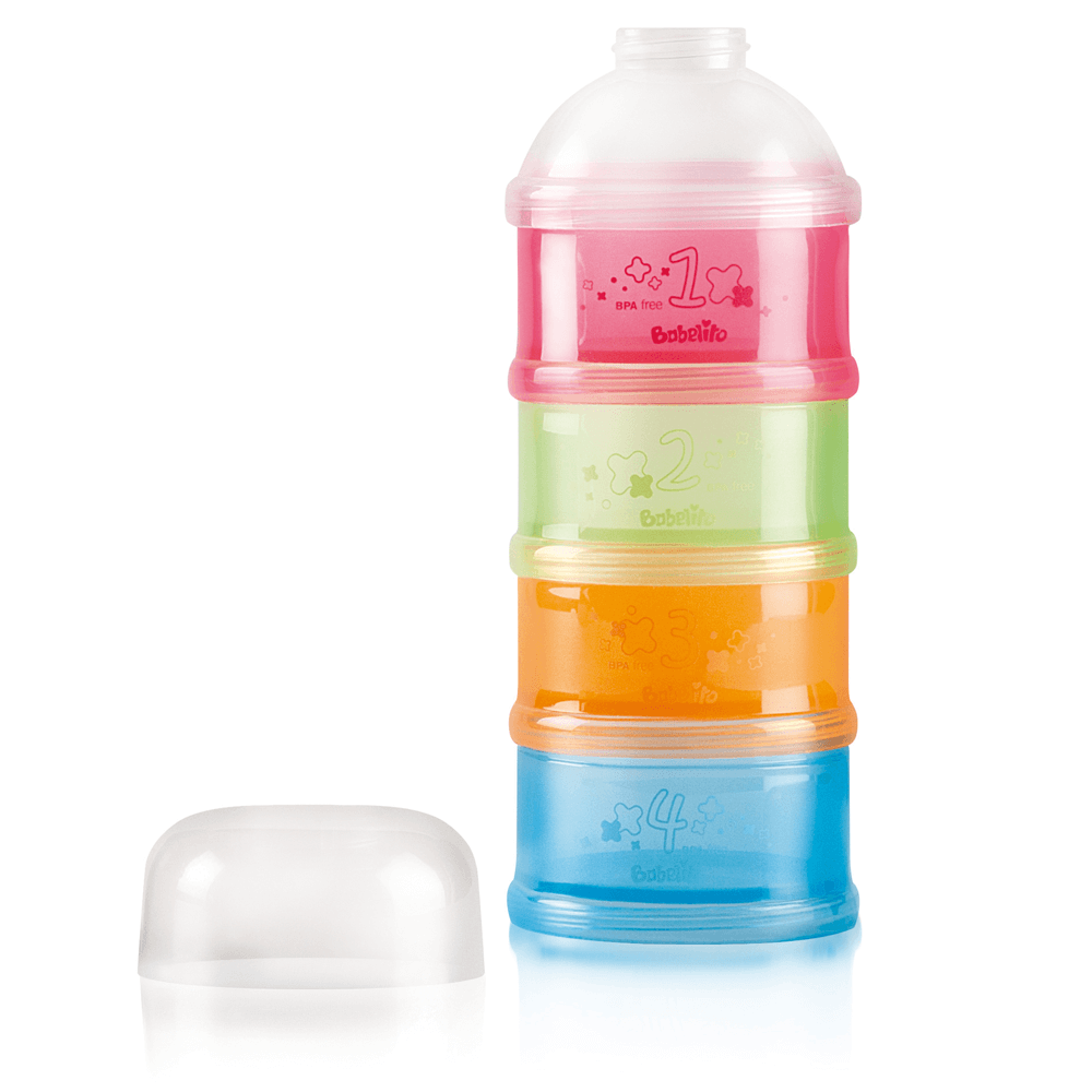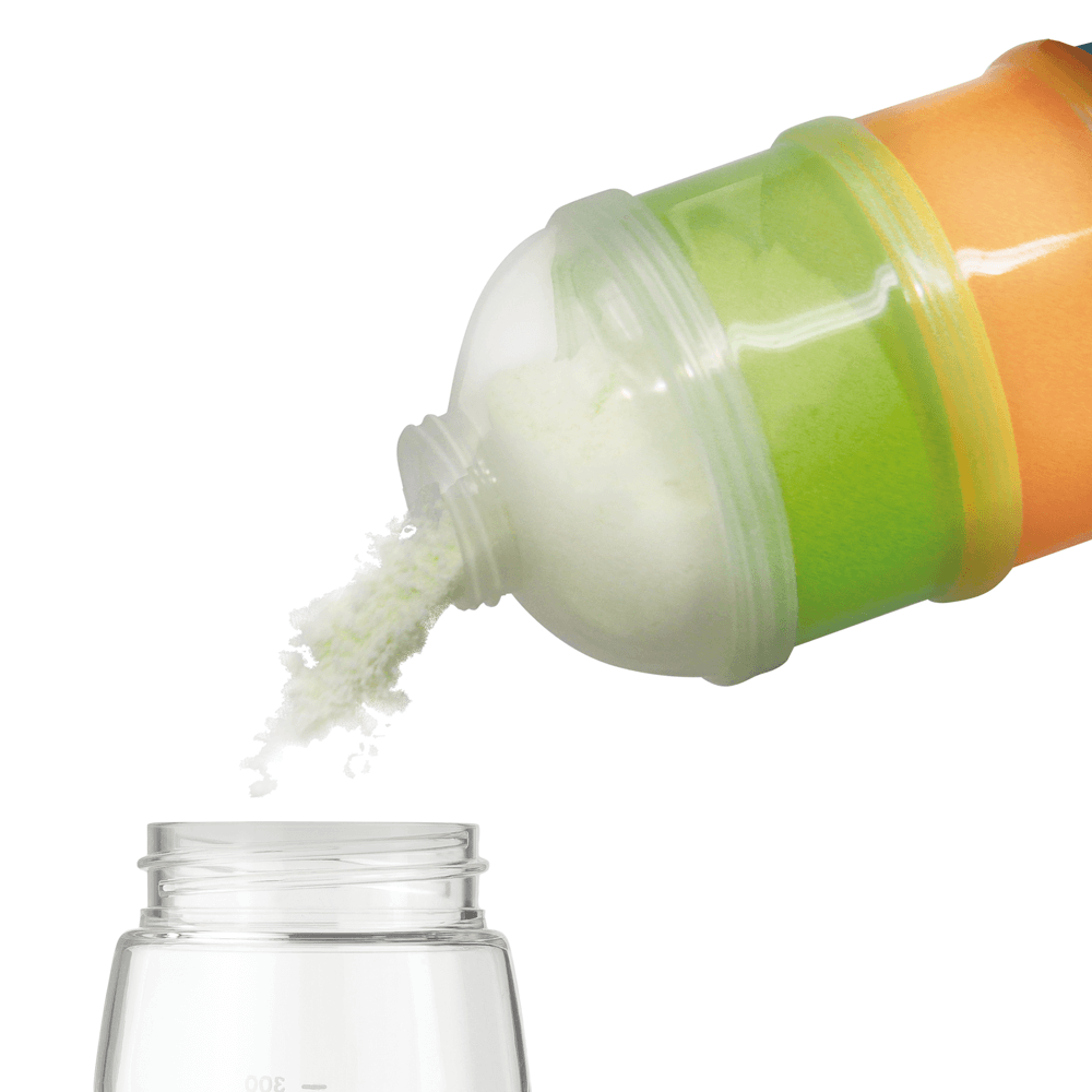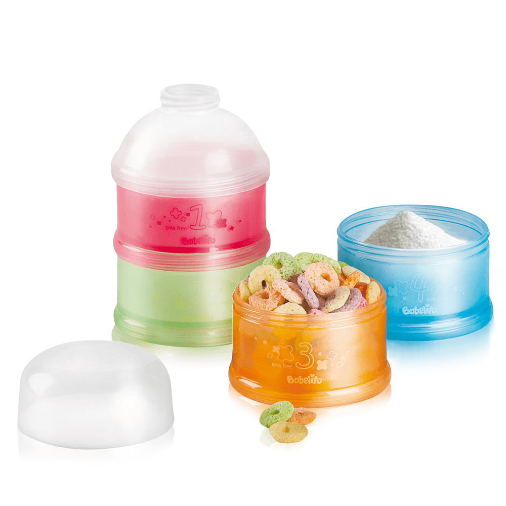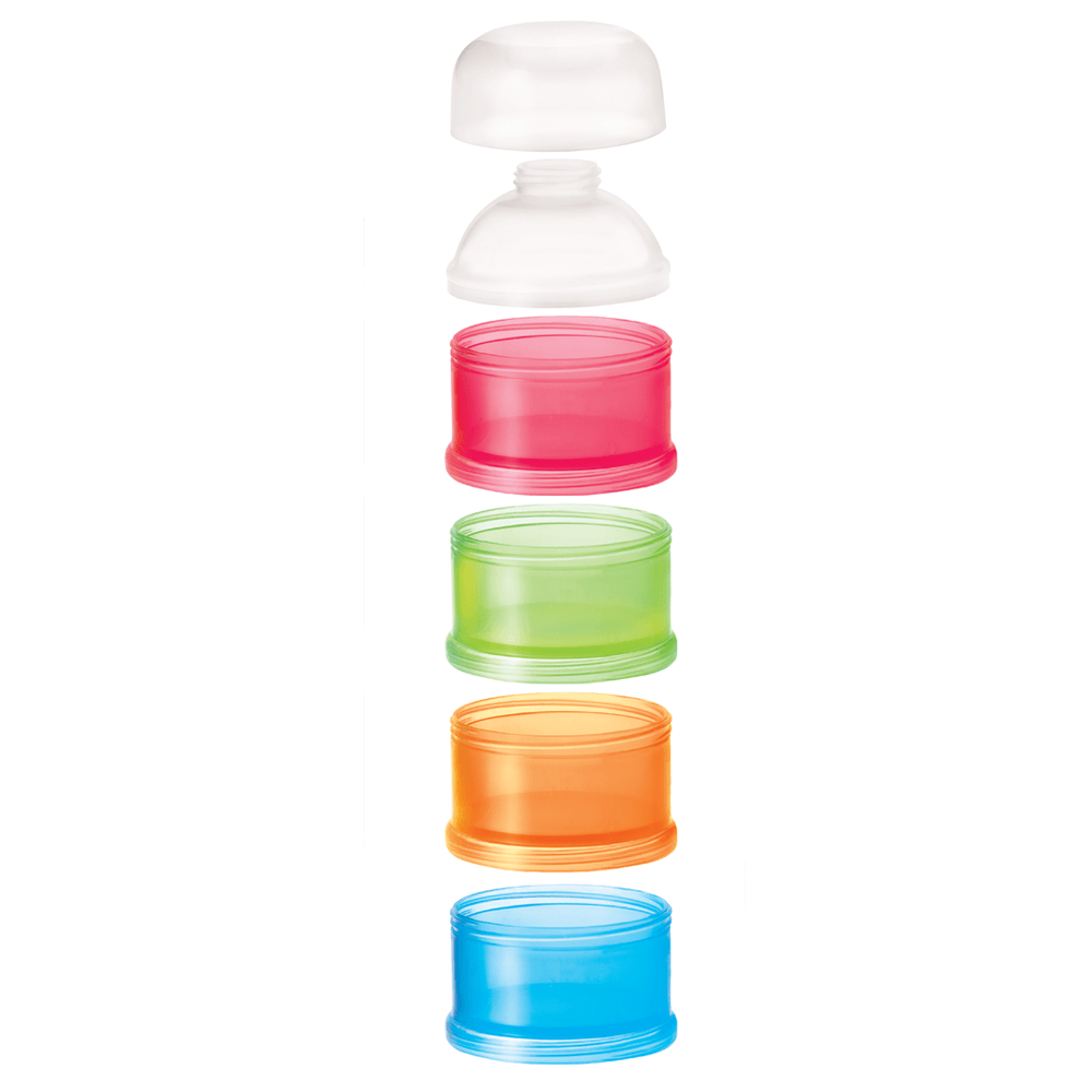Nuestro dosificador con 4 módulos te ayuda a transportar la leche en polvo de tu bebé y prepararla justo antes del momento de la toma. El dosificador tiene una tapa embudo muy práctica que permite volcar el polvo hacia cualquier tipo de botella. Al ser módulos independientes con roscas, te permiten además llevar galletas, cereales y frutas, sin mezclarse. Ideal para usar tanto en casa como de paseo o viajes cortos.