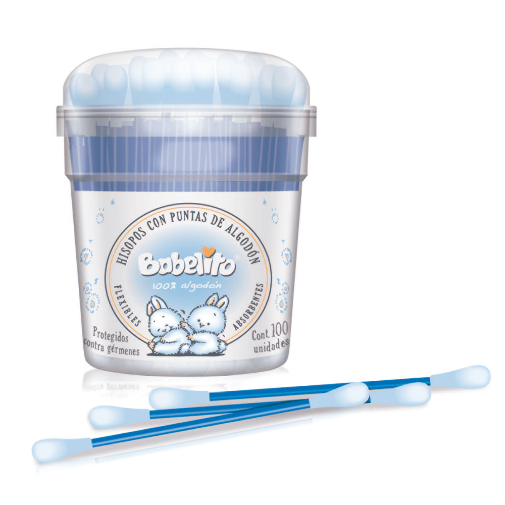 Los Hisopos con puntas de Algodón Babelito están tratados con una solución anti-germen que ayuda a evitar su contaminación. Son recomendados por los pediatras para limpiar y desinfectar el cordón umbilical desde el nacimiento hasta su posterior caída. También es recomendado para higienizar la parte EXTERIOR de las orejas, con especial cuidado de NO introducirlos en el canal auditivo. En caso de que sea necesaria la higiene del canal auditivo por un excedente de cera, dicho procedimiento debe ser realizado por un médico especialista. Vienen en un práctico pote plástico con tapa de 100u, que los mantiene limpios y secos.